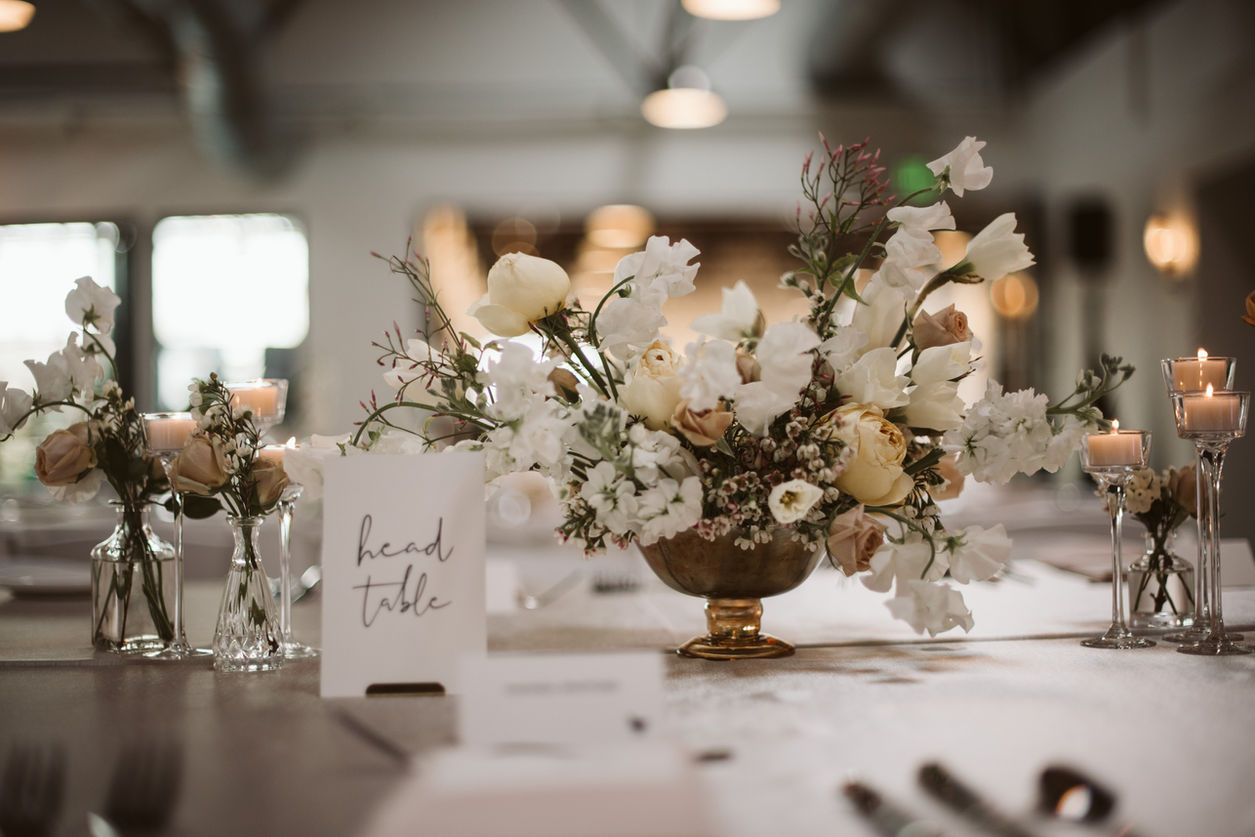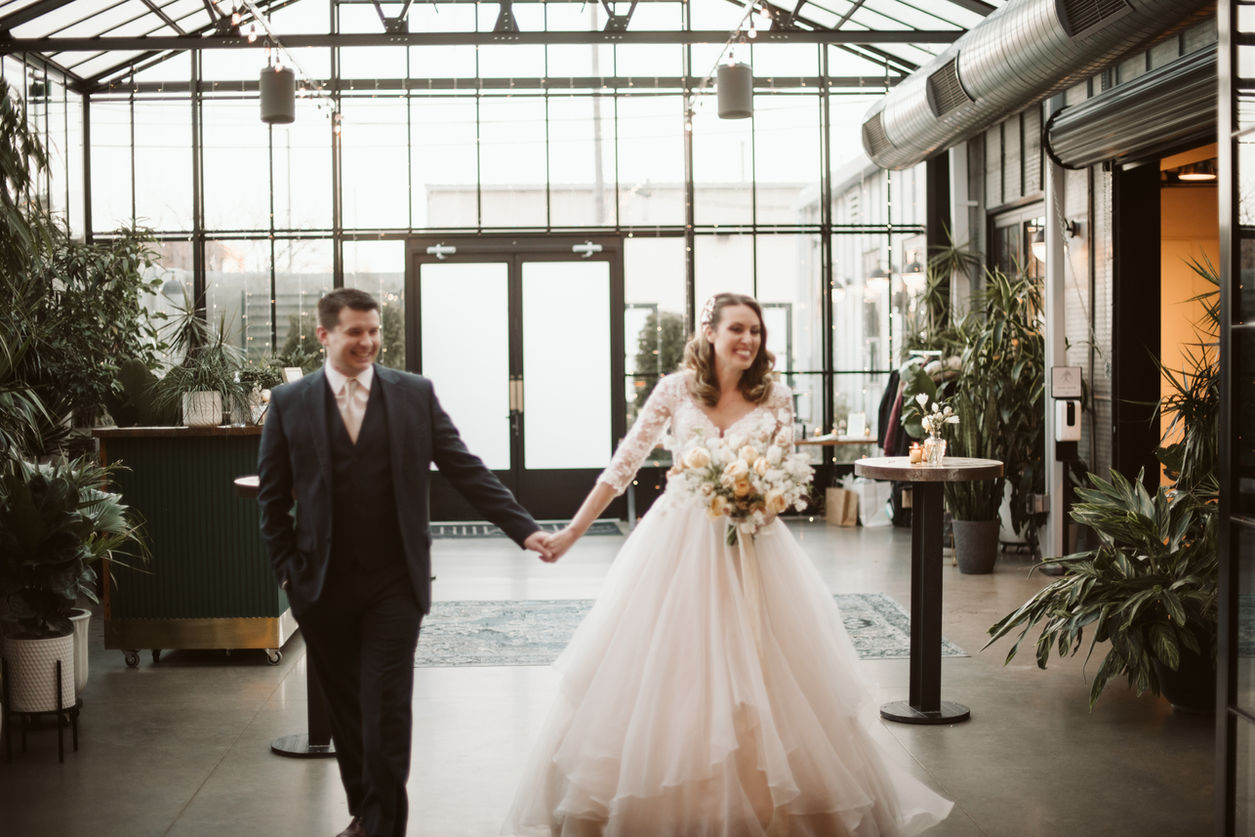 I love when the flower color palette can play off of and accentuate the natural beauty of a venue, and nowhere is this more possible than at The Tinsmith in Madison. The modern, greenhouse-meets-industrial vibe was the most gorgeous backdrop for this fresh spring flower scheme, which featured the softest yellows and blushes, alongside white and greenery.